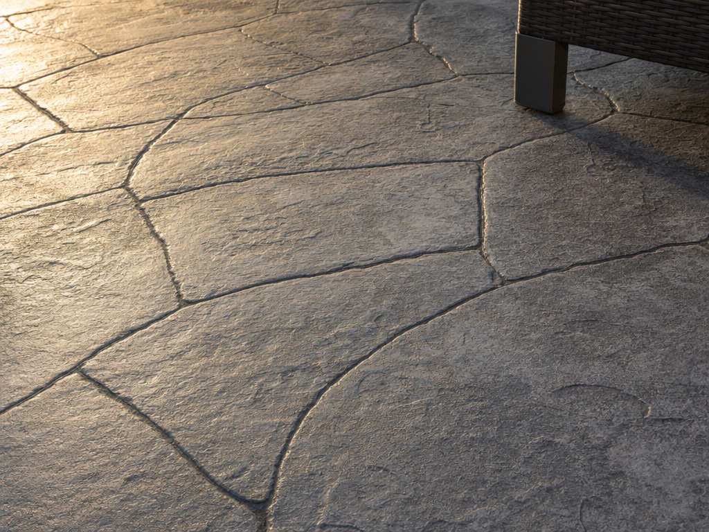 Slate, ashlar, cobblestone, brick, wood-plank, and custom pattern stamps. Color-hardened with antiquing release for depth that solid colors can’t match.