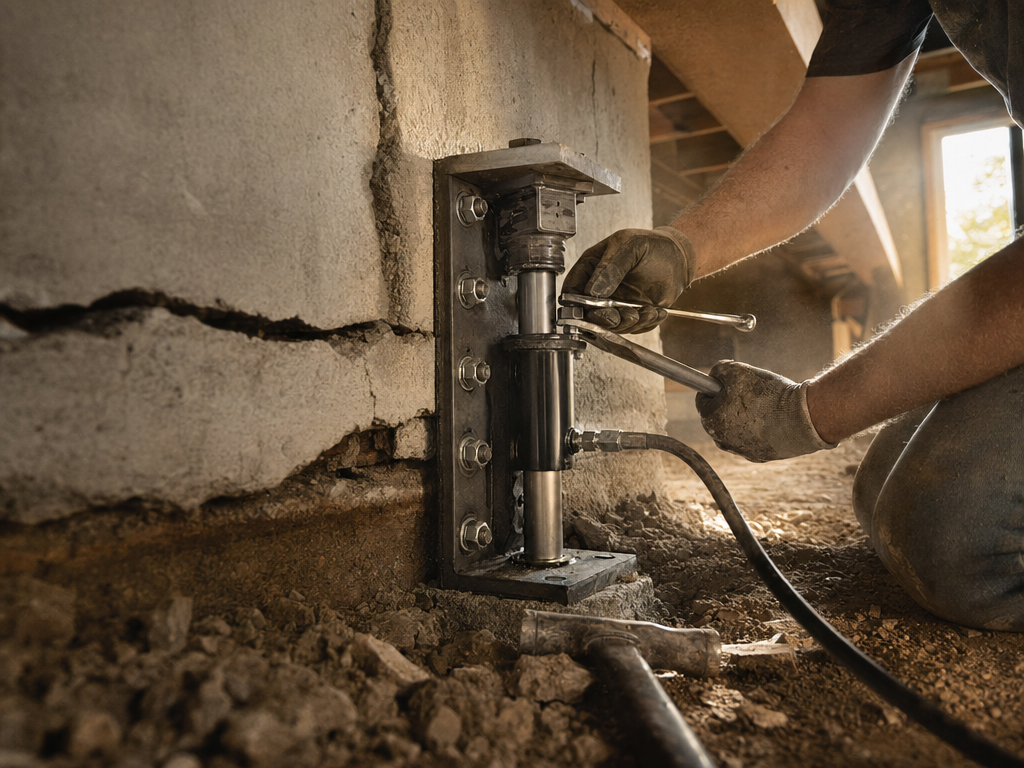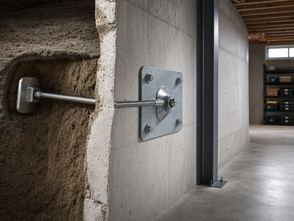 Stabilization for bowing or buckling basement walls. Permanent fix to prevent further movement, often invisible after finishing.
