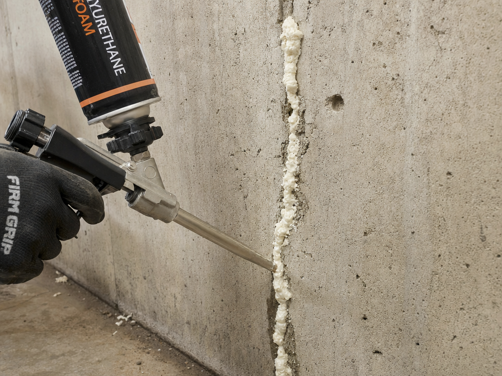 Polyurethane or epoxy injection seals foundation cracks against water intrusion. Fast, no excavation, lifetime-warrantied.