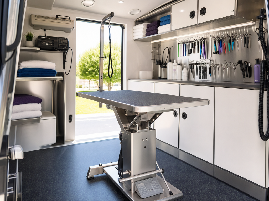 Fully-equipped mobile grooming van service that comes to your driveway. Your dog gets a calm one-on-one groom in a familiar environment — no kennel time, no drop-off, no stress.