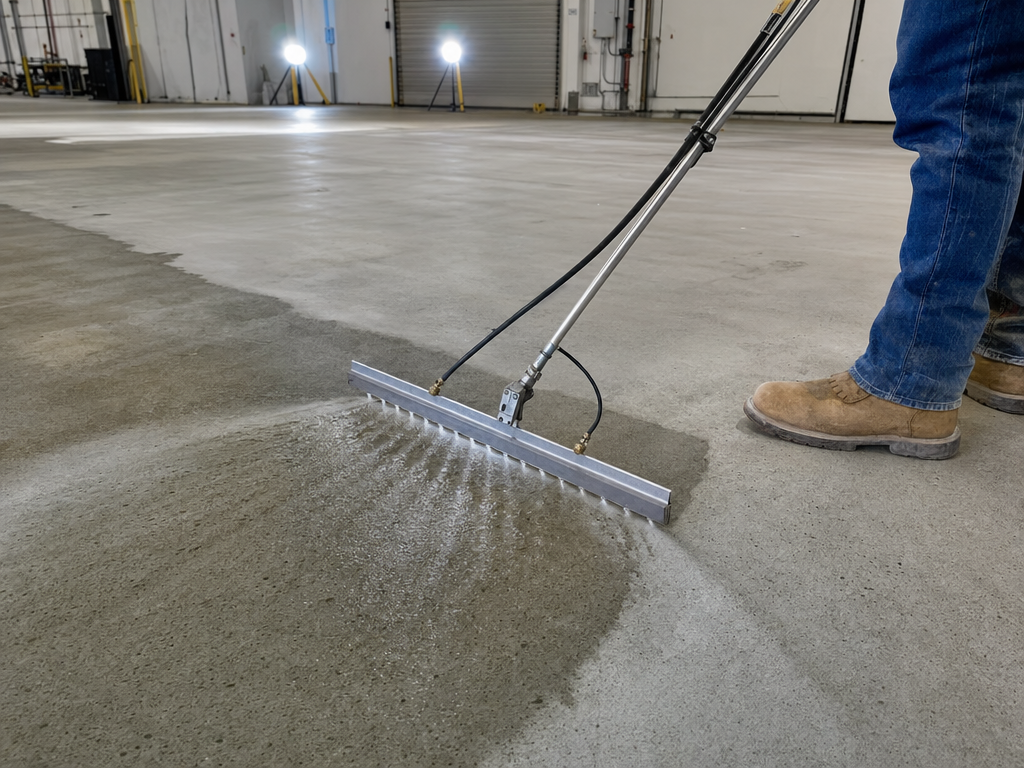 Lithium-silicate or sodium-silicate densifier penetrates the slab to chemically harden the surface. 30–40% increased abrasion resistance, dust-proofed for the life of the floor.