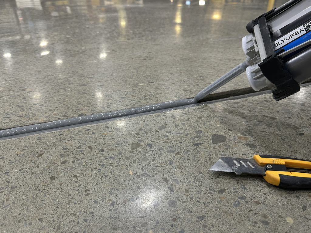 Semi-rigid polyurea joint fill rated for forklift traffic. Crack stitching and full-depth repairs before polishing so the finished floor stays flat under load.