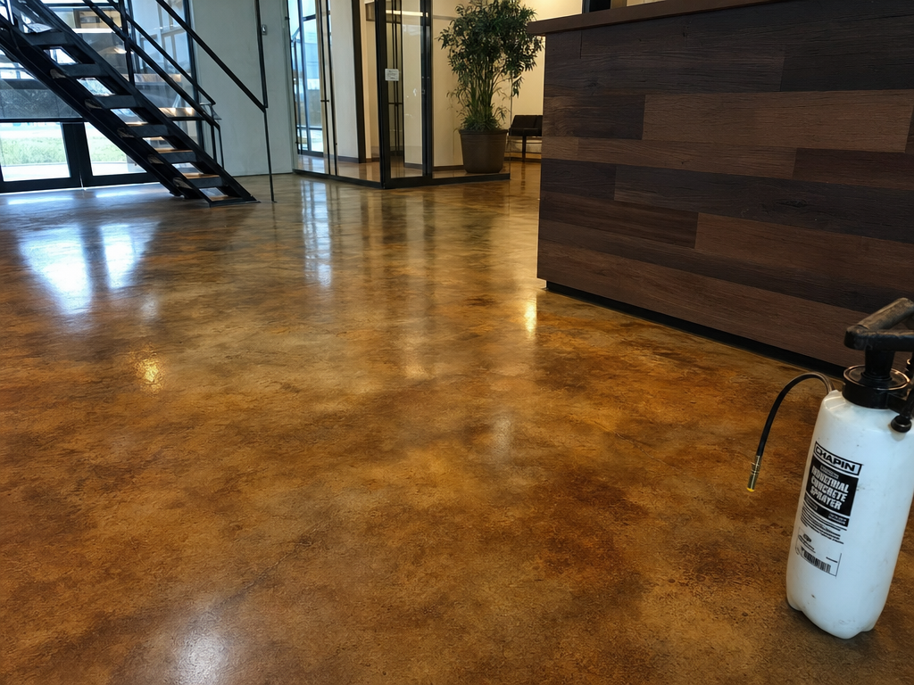 Acid stains, water-based dyes, and integral colors for showroom, retail, and brand-spec finishes. Sealed and topped with a wear-resistant guard coat.